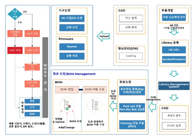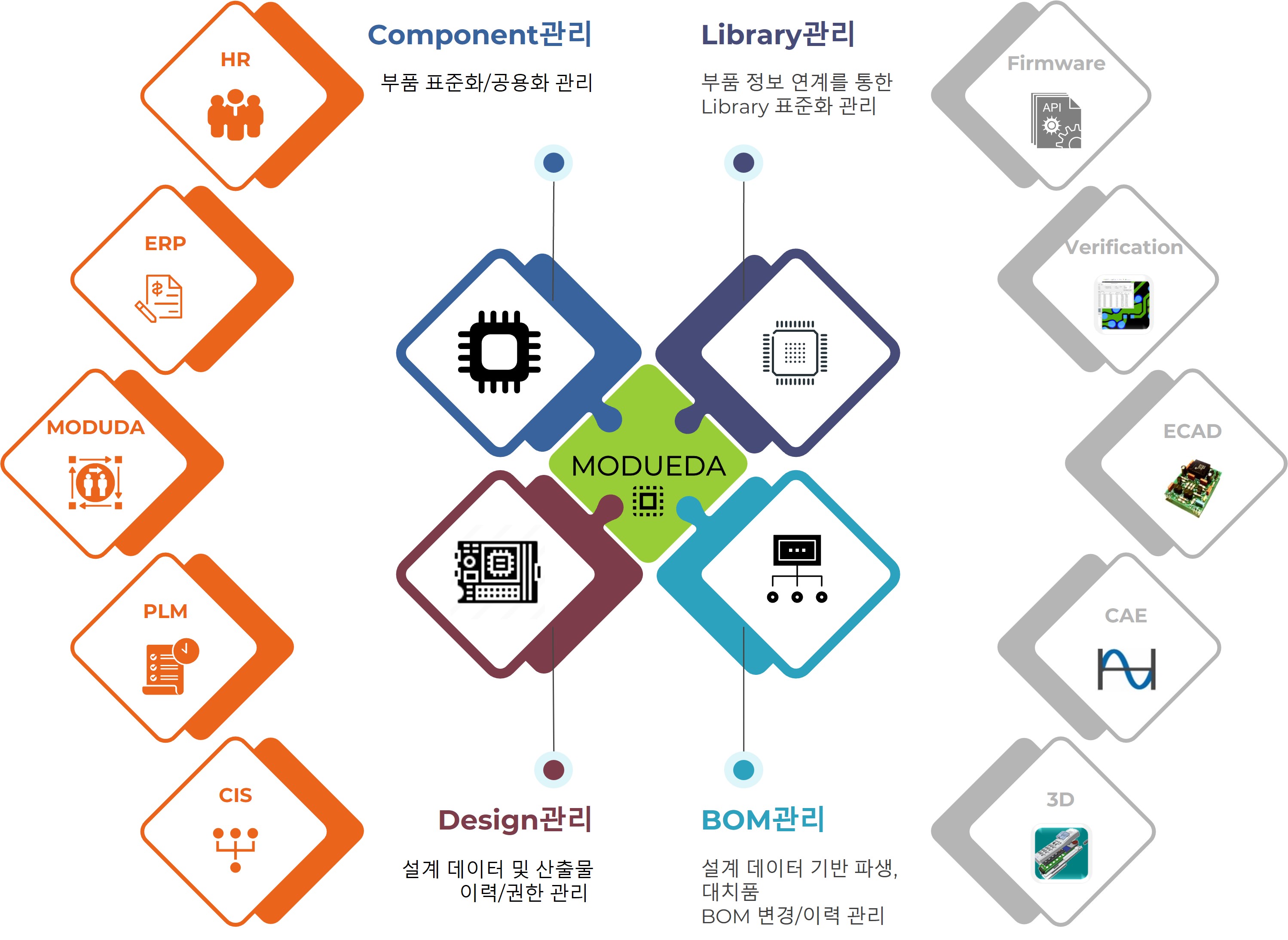 MODUEDA 솔루션은 Workflow 기반 부품정보, Library 정보, 설계데이터 및 산출물, BOM의 통합관리를 통한 업무 효율화 환경을 제공합니다.