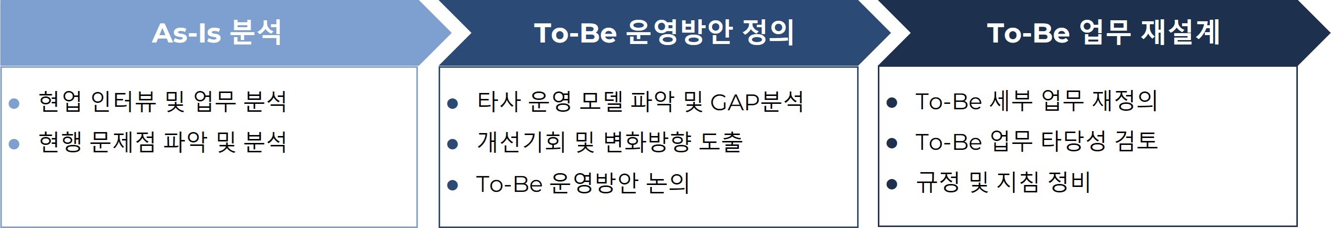 현재 업무의 문제점 파악 및 선진사와의 차이 분석을 통해 To-Be 업무를 도출하고, 전사적 업무 프로세스를 재설계 합니다.